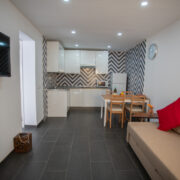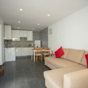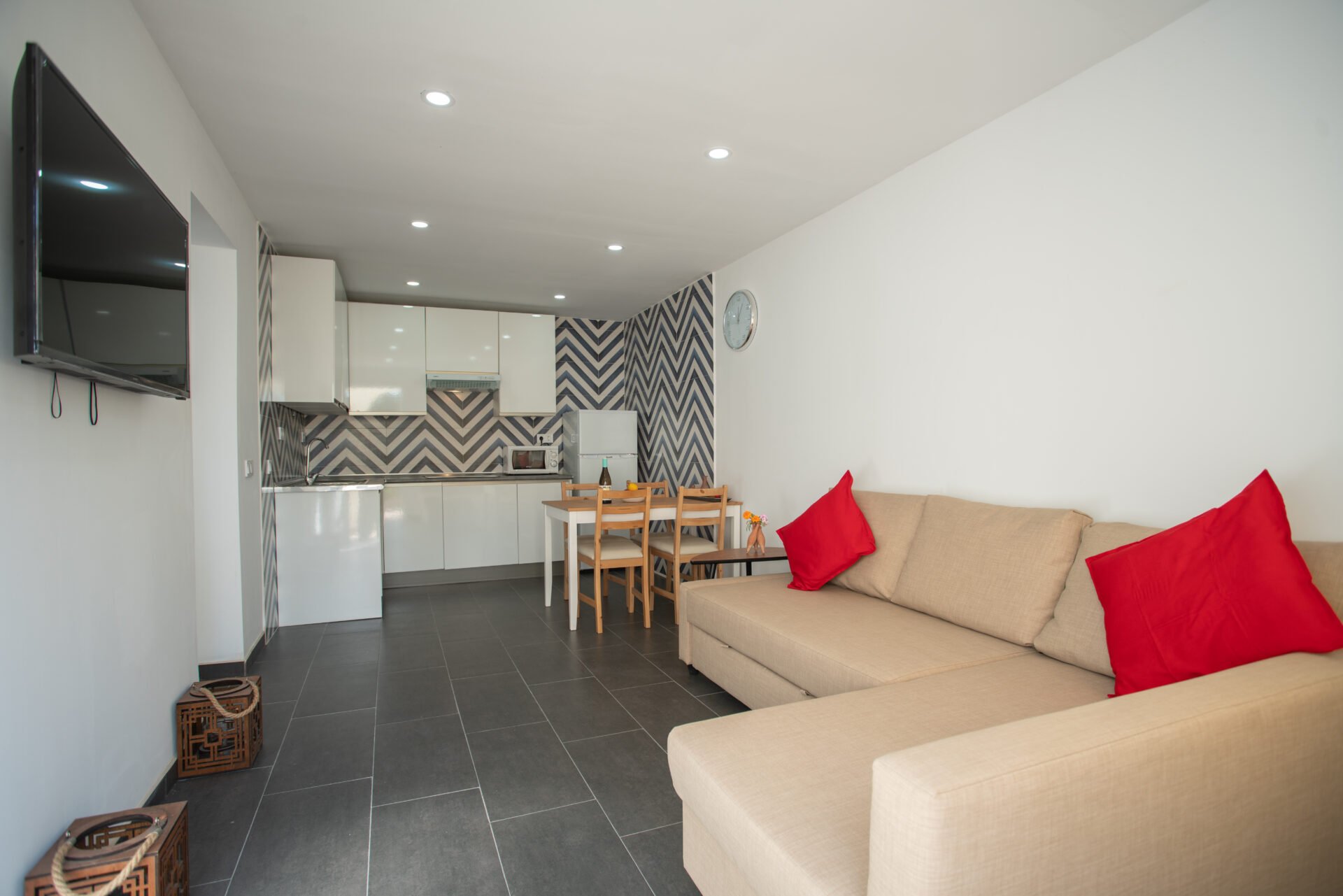 En su entrada podrá encontrar una preciosa sala de estar con un sofá de color beige fácilmente convertible en cama doble y una mesa comedor junto a un armario empotrado al fondo encontraremos la cocina.