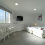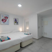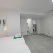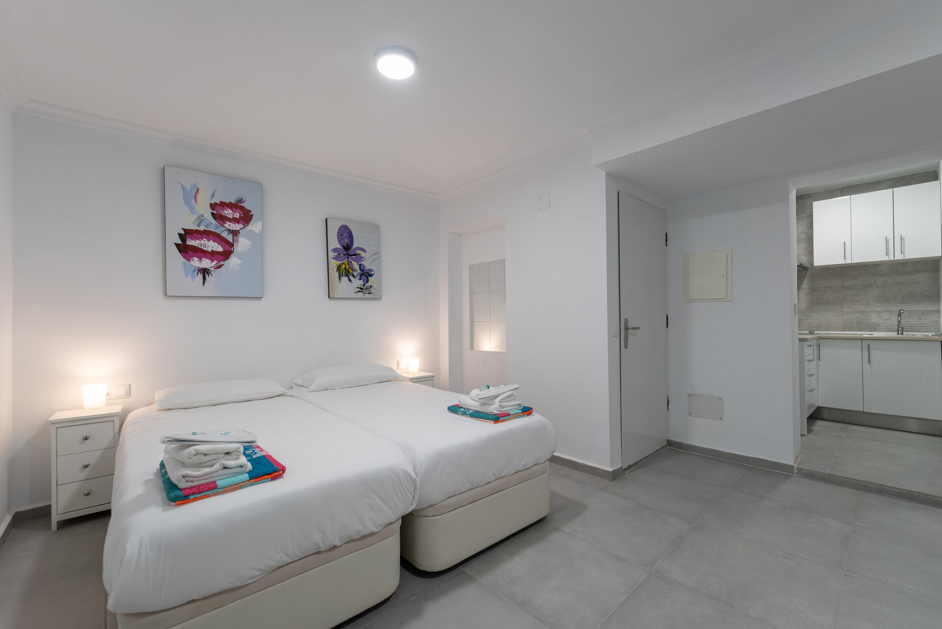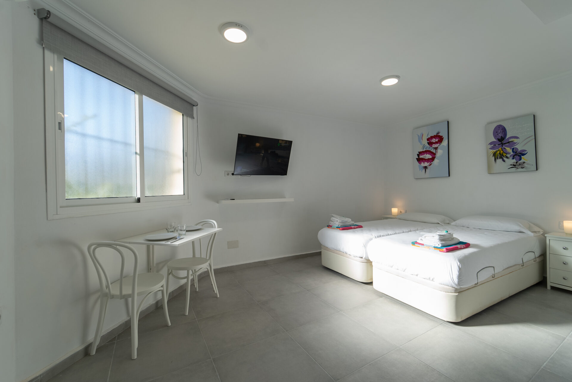 En su entrada podrá encontrar una precioso dormitorio con dos camas individulaes y una mesita para comedo junto a un armario empotrado.