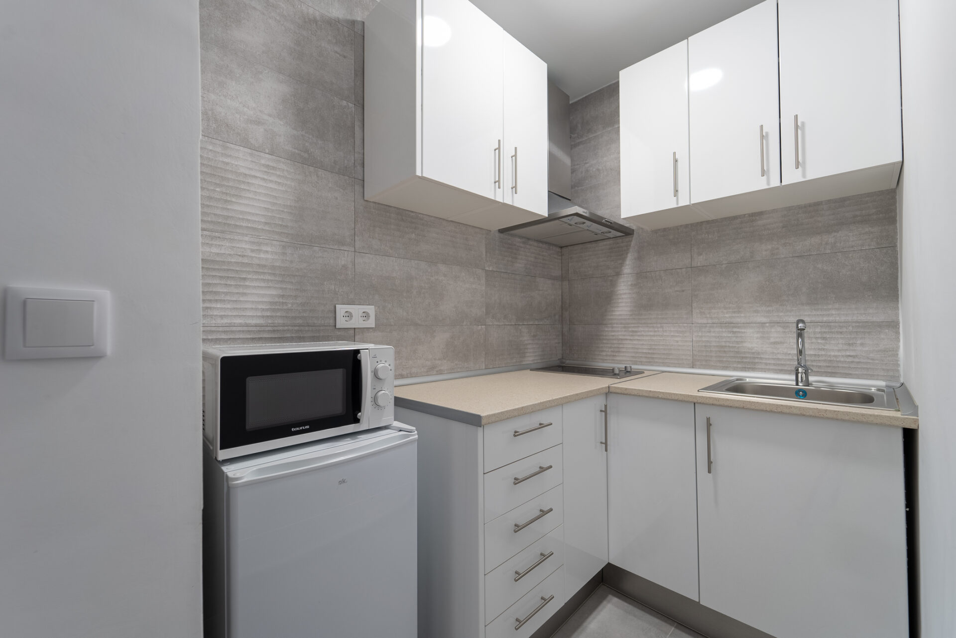 A un lado del dormitorio encontraremos la cocina y un cuarto de baño con bañera completamente equipado.
